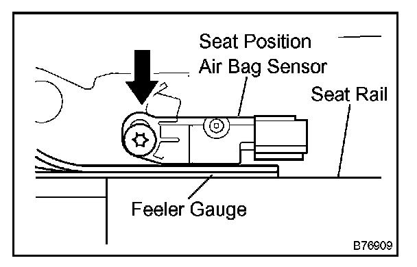 b. Install a 1 mm (0.04 in.) feeler gauge between the slide rail and seat position air bag sensor as shown in the illustration.