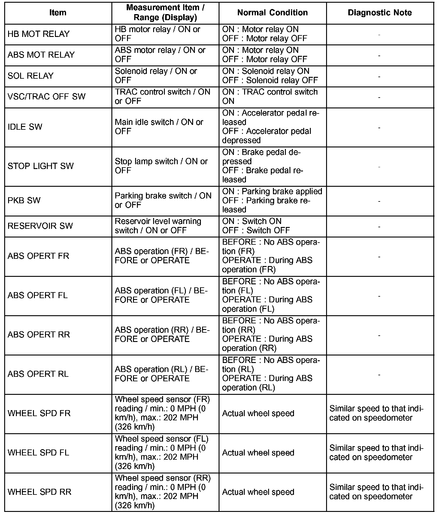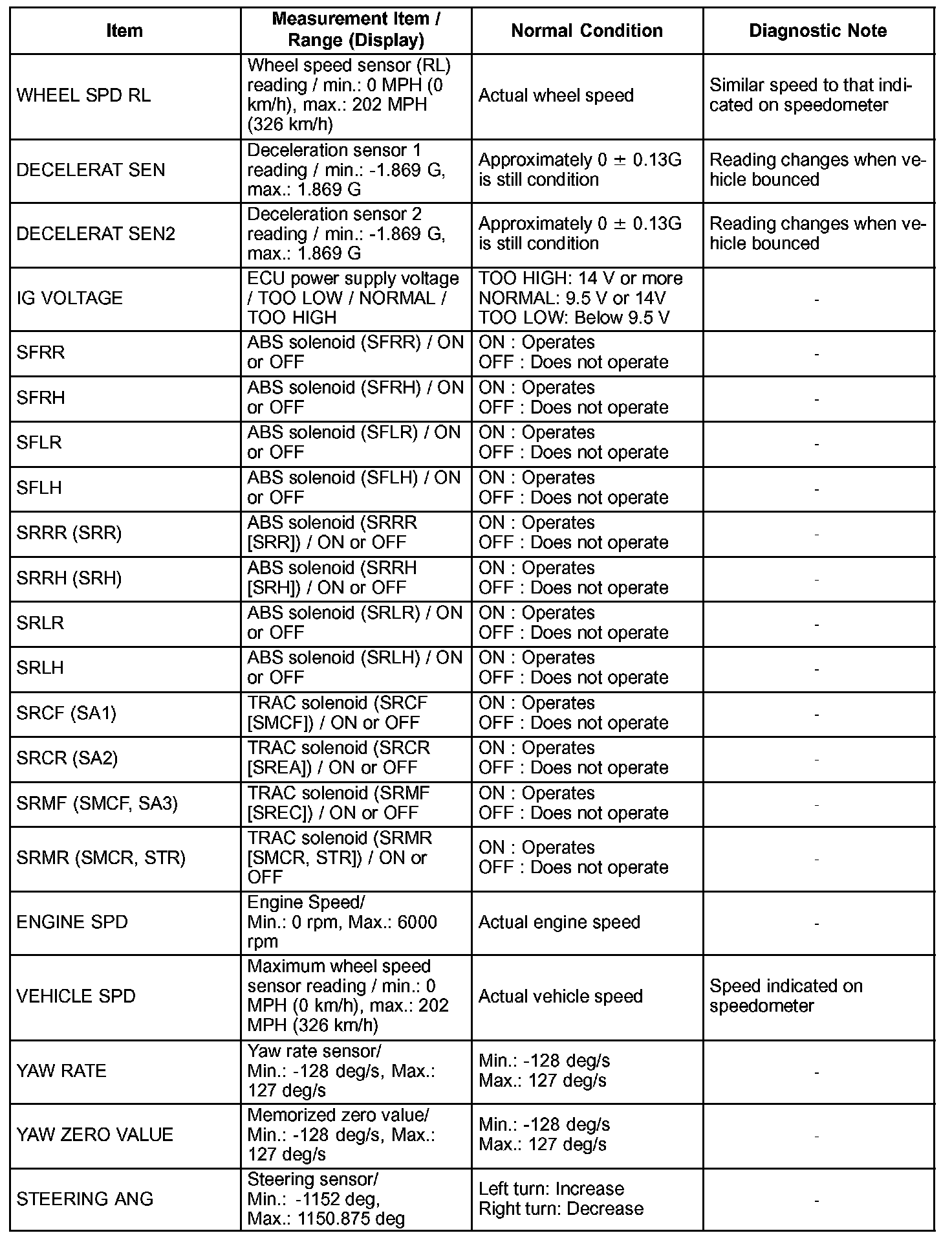 HINT: With the hand-held tester connected to the DLC3 and the ignition switch in the ON position, the ABS, TRAC and VSC data list can be displayed. Follow the prompts on the tester screen to access the DATA LIST.
