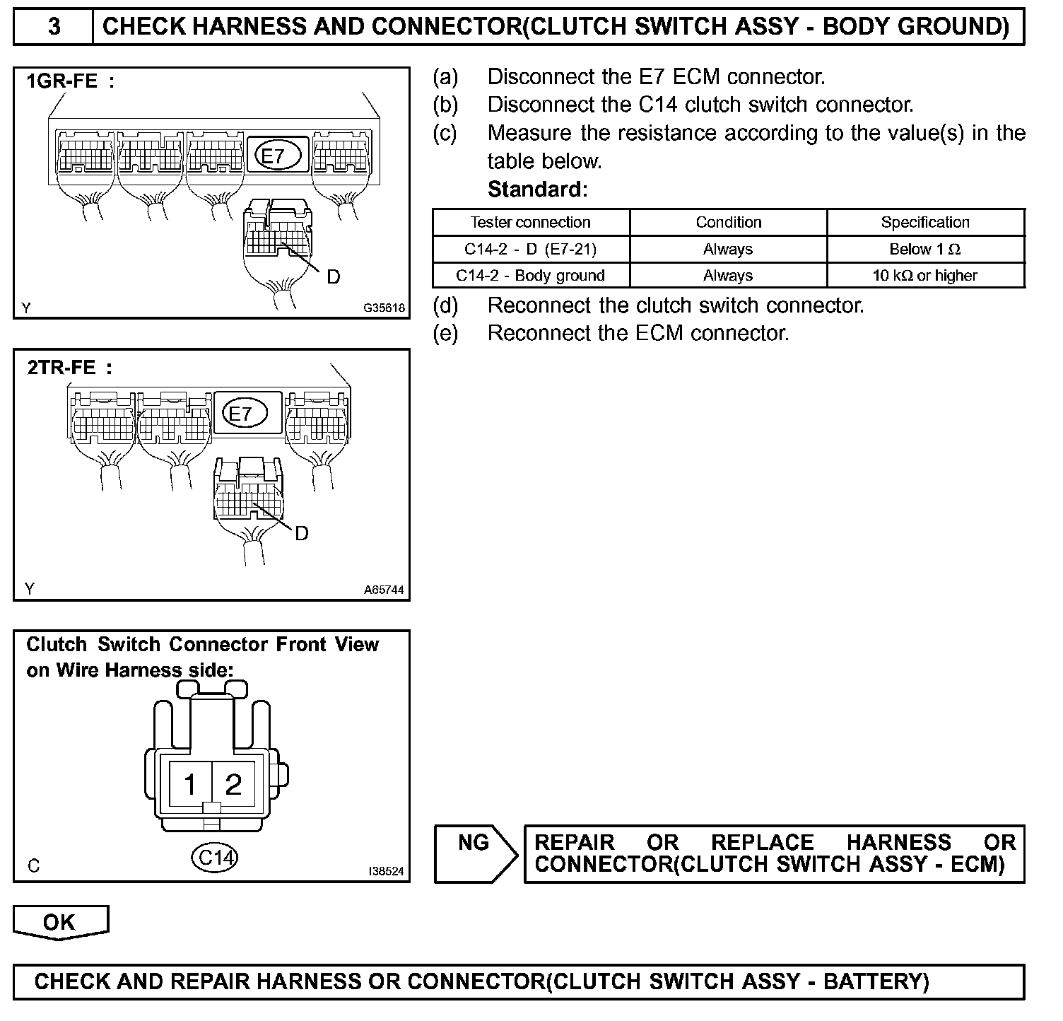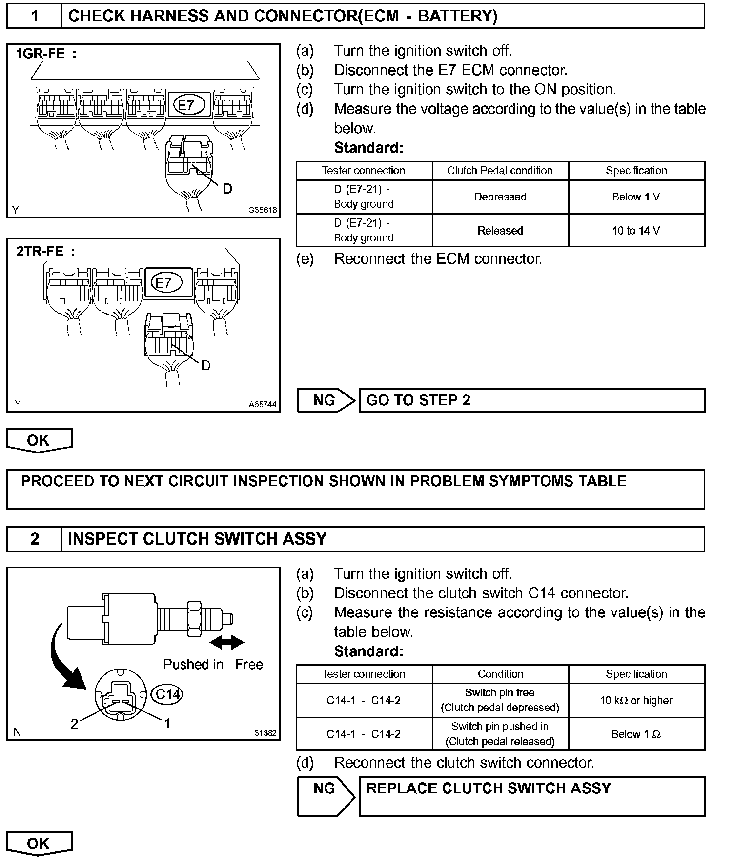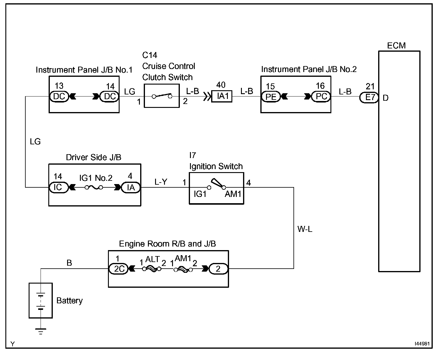 When the clutch pedal is released, the ECM receives the positive (+) battery voltage through the IG1 No.2 fuse and ignition switch. While the clutch pedal is depressed, the clutch switch assembly sends a signal to terminal D of the ECM. The ECM cancels cruise control when terminal D receives the signal (voltage of below 1 V).