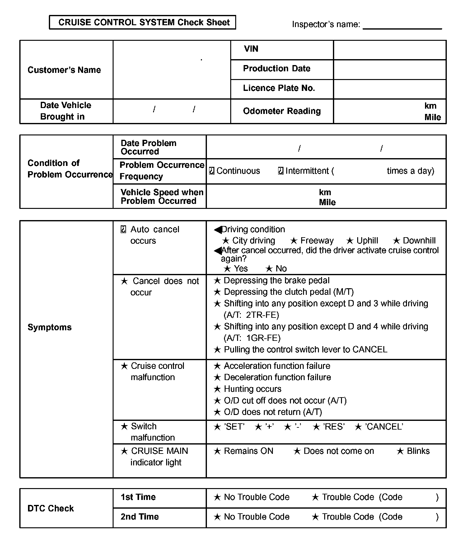 Cruise Control System Check Sheet: