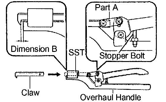 a. Engage the claw with the overhaul handle by inserting it into the hole in part A as shown in the illustration.