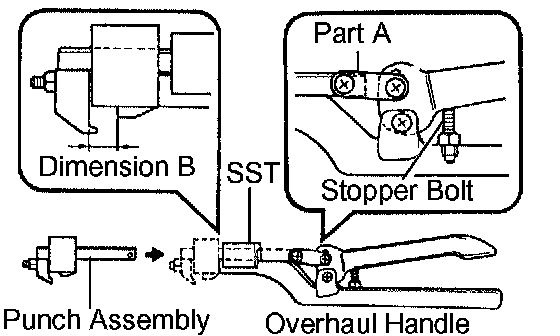 a. Install the punch assembly into the overhaul handle by inserting it into the hole in part A as shown in the illustration.