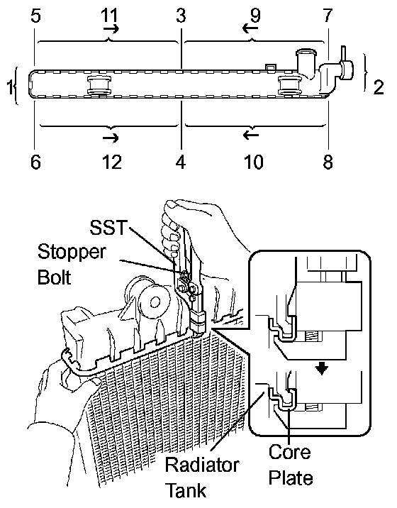 a. Gently press SST against the core plate in the order shown in the illustration. After repeating this a few times, fully caulk the core plate by gripping the handle until stopped by the stopper bolt.