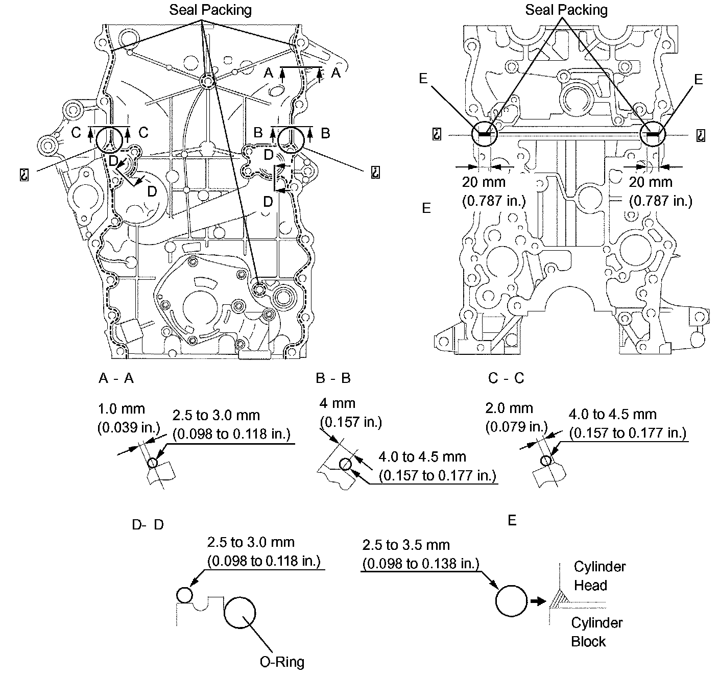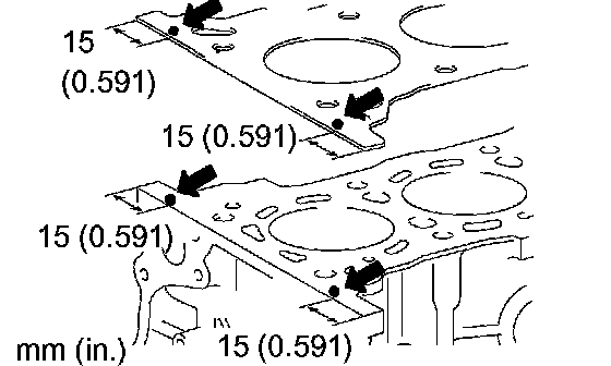 a. Apply a continuous bead (seal width: 4 to 7 mm (0.15 to 0.28 inch)) of seal packing to the cylinder block upper side and cylinder head gasket upper side as shown in the illustration.