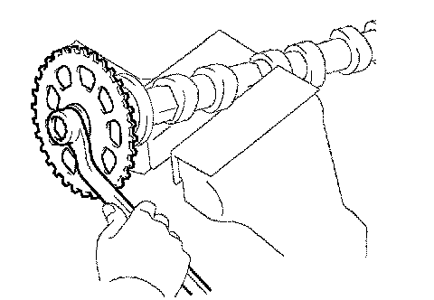 a. Clamp the camshaft in a vise and then install the camshaft timing sprocket to the camshaft with the sprocket bolt.