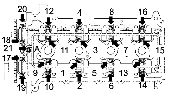 e. Tighten the 21 bolts and 20 washers in the order shown in the illustration.