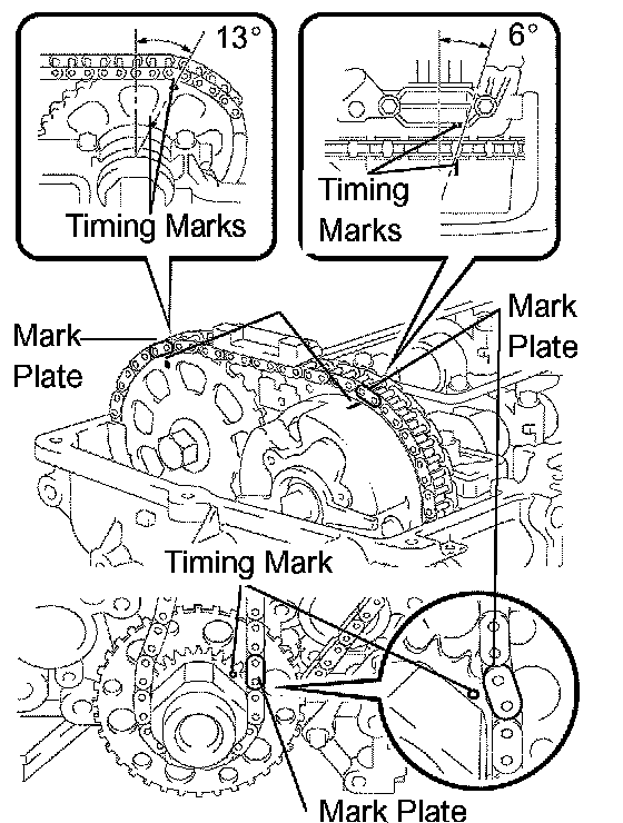 a. As shown in the illustration, install the chain on the sprocket and gear with the painted marks aligned with the timing marks on the sprocket and gear.