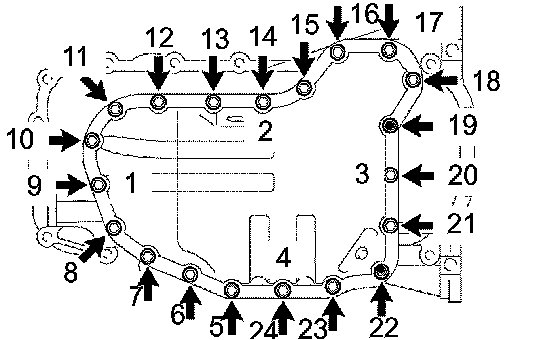 e. Uniformly tighten the 16 bolts and 2 nuts in the sequence shown in the illustration.