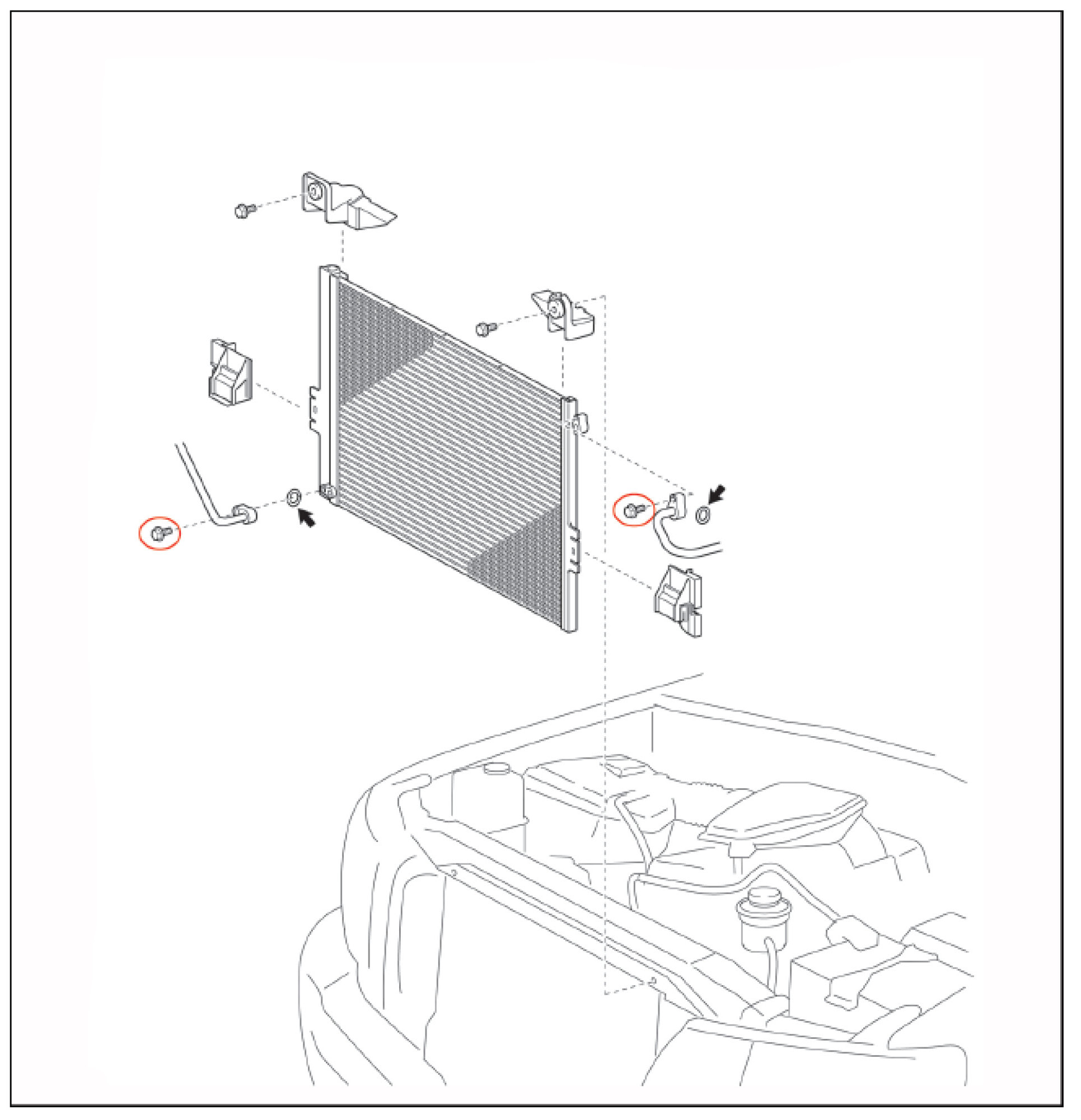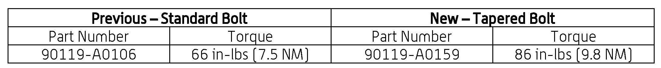 To minimize cross threading of the condenser during assembly, the condenser line bolts have been changed to tapered bolts. The tapered condenser line bolts have an increased torque specification. Refer to the table below for the proper torque specifications for the condenser line bolts.
