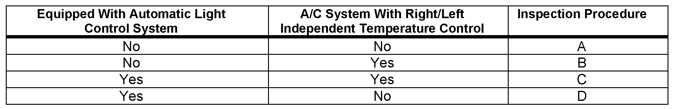 Four types of solar sensors are used on Toyota vehicles depending on the vehicle specifications. The inspection procedure for each type of sensor differs from the others. Select the appropriate inspection procedure from the table according to vehicle specifications and perform the inspection.