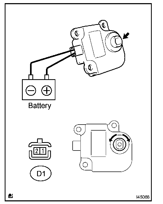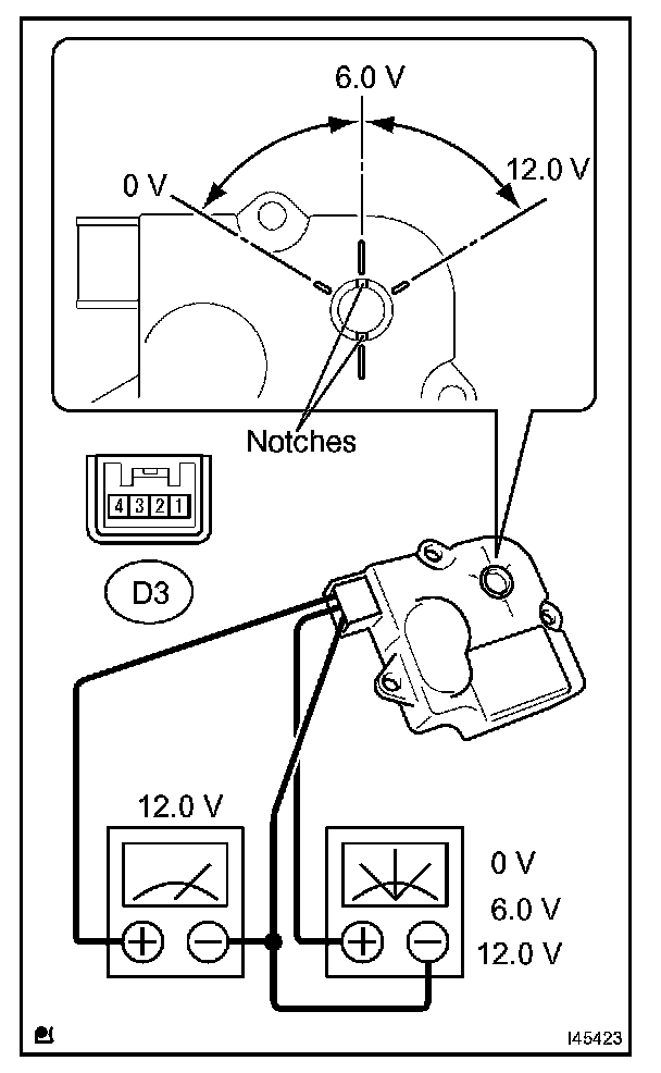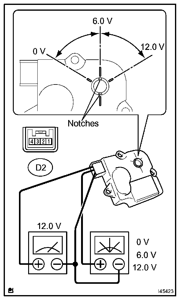 1. When 12V is applied between terminals 4 (IGN) and 1 (GND), and 0V is applied between terminals 2 (SIG) and 1 (GND), check that the line connecting the 2 notches moves to the 0V position. If the result is not as specified, replace the air mix control servomotor.