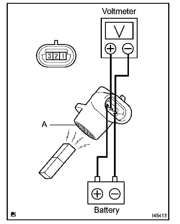 2. When surface A of the compressor pick up sensor is close to the S-pole, the voltage between terminals 1 (MG+) and 2 (SSR+) increases. When it is close to the N-pole, the voltage between the terminals decreases.