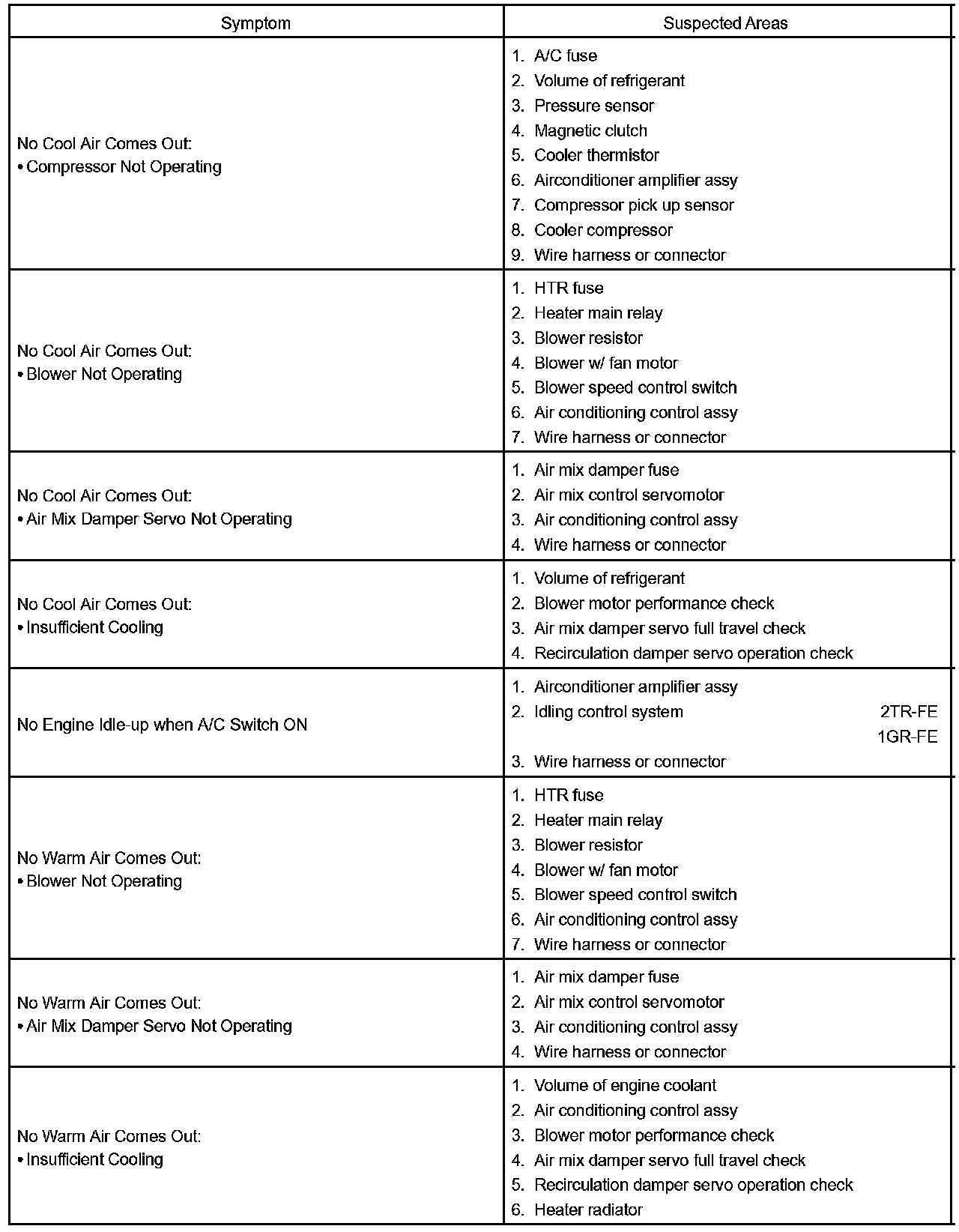 HINT: Inspect the fuses and relays before inspecting the suspected areas shown in the table.If the malfunction still exists even after checking and confirming that all the suspected areas are normal, replace the A/C amplifier.
