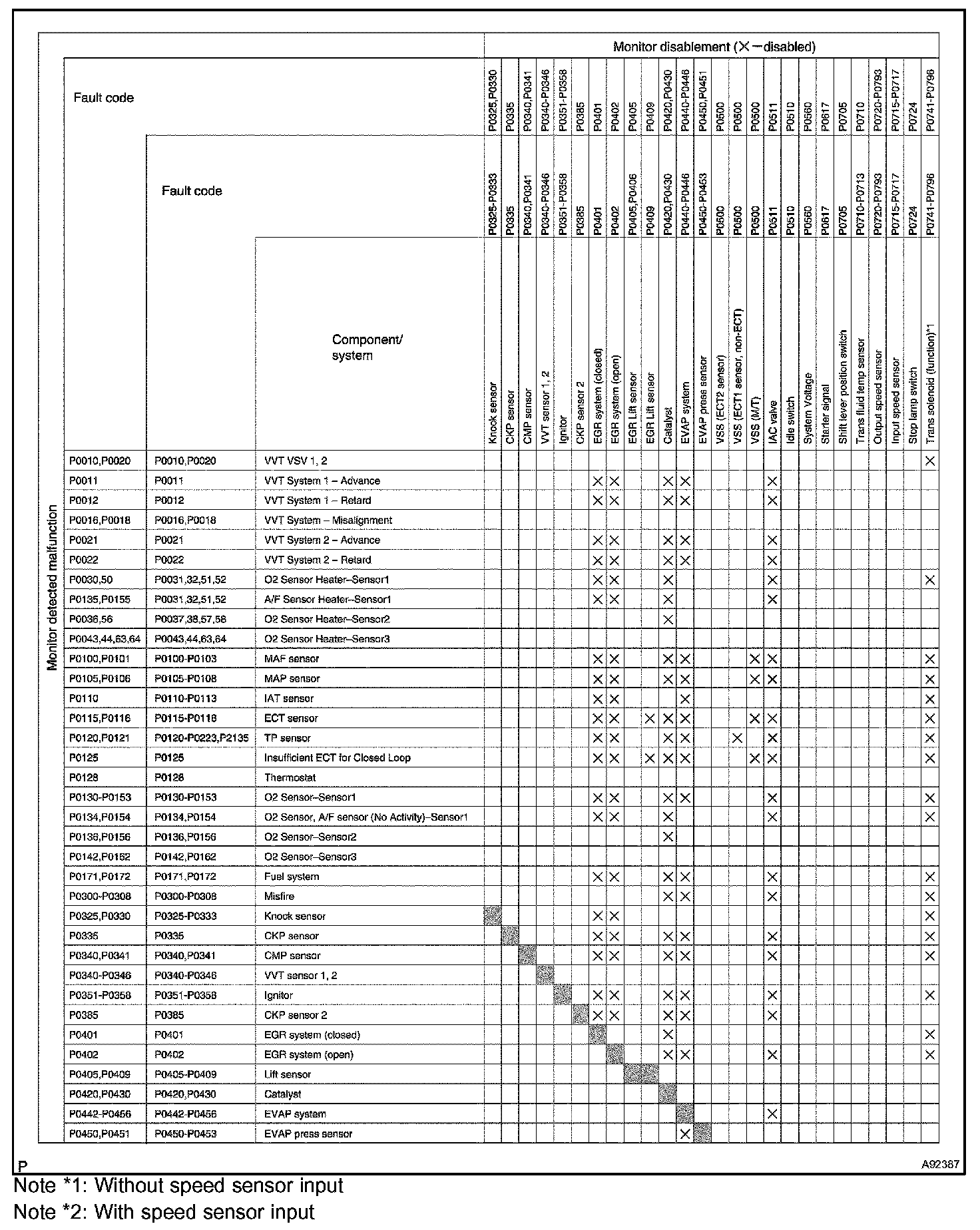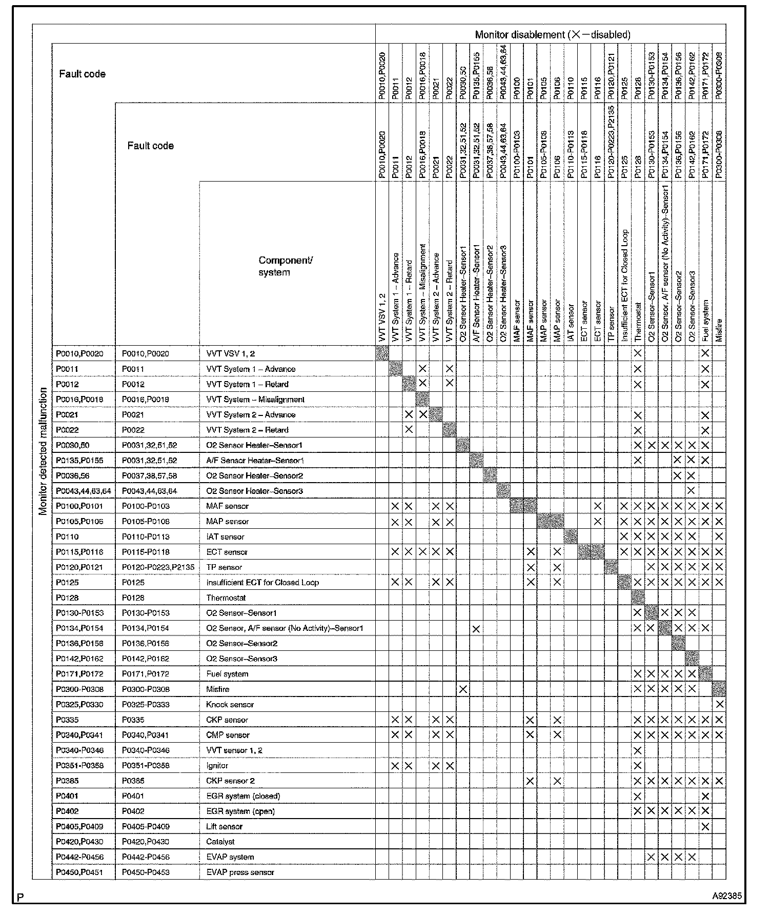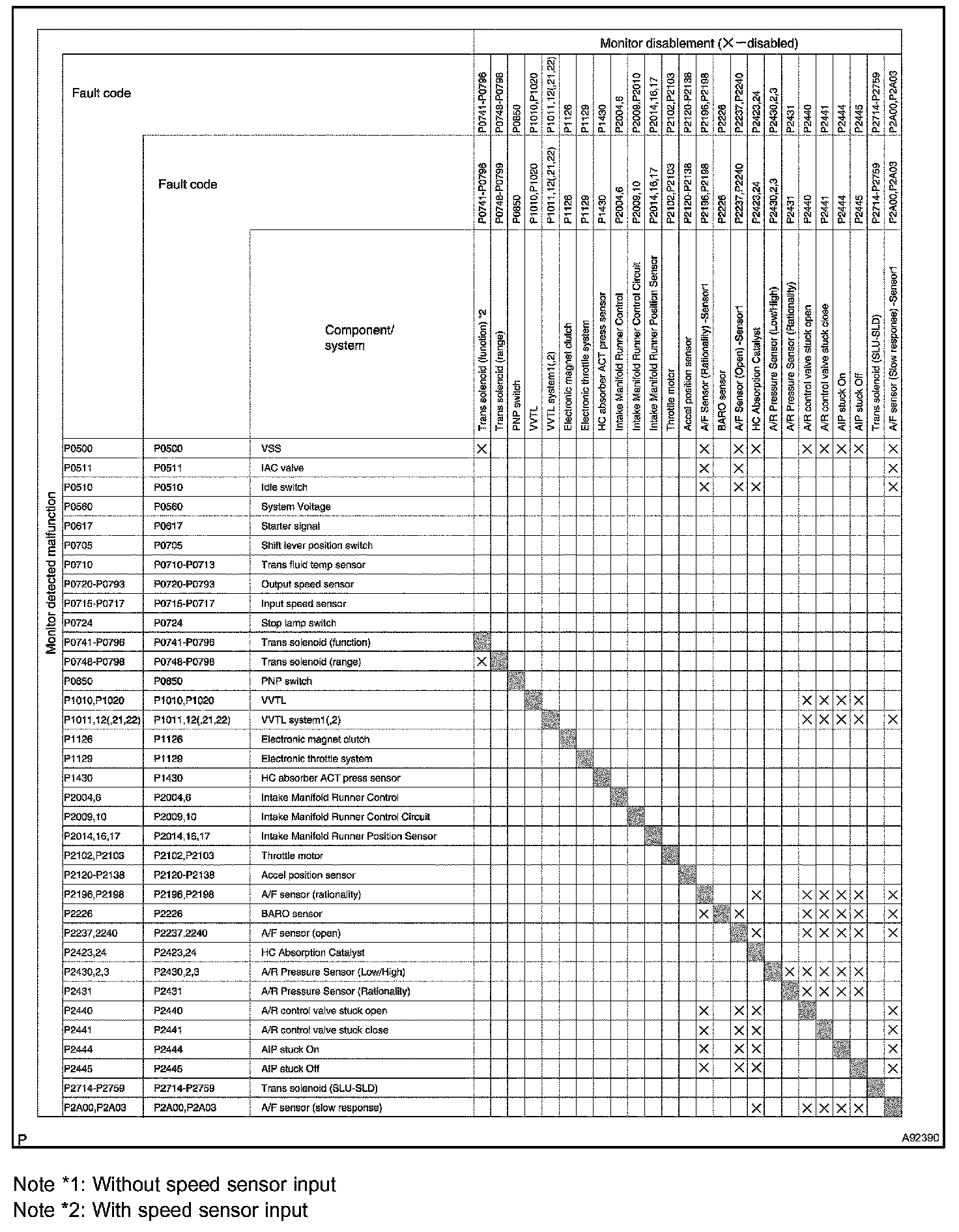 "X" indicates that when the DTC on the left is stored, detection of the DTC in the upper column is not performed.
