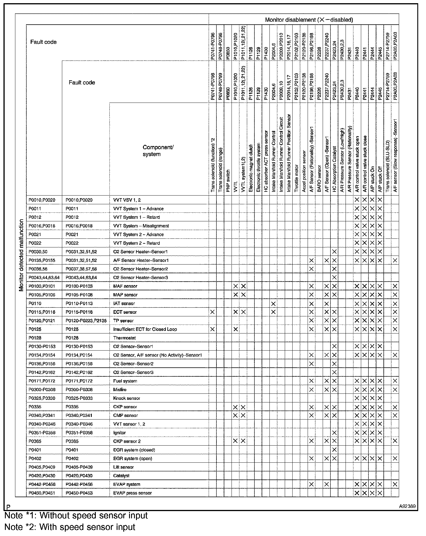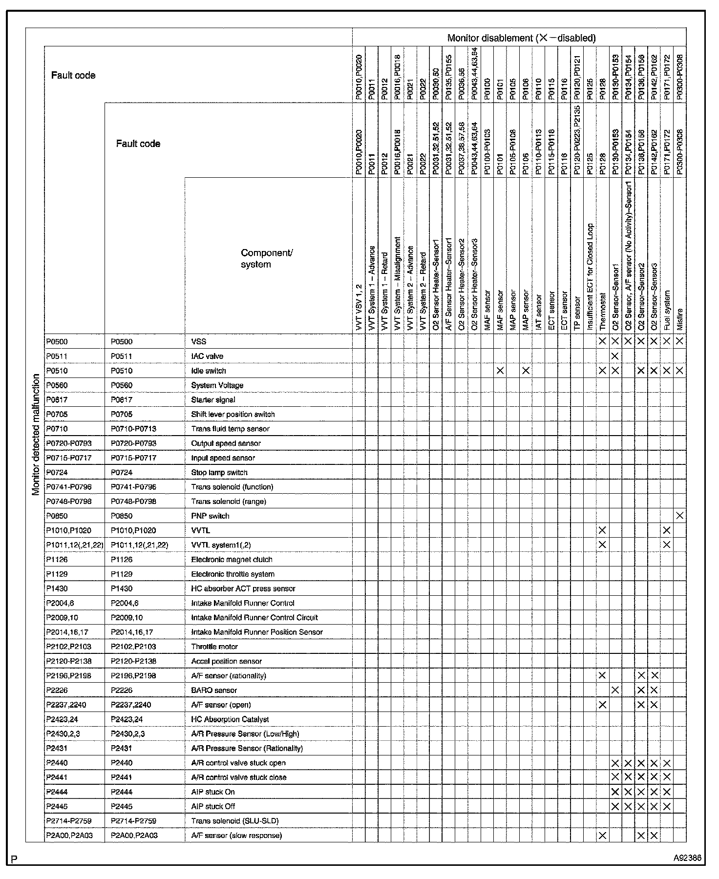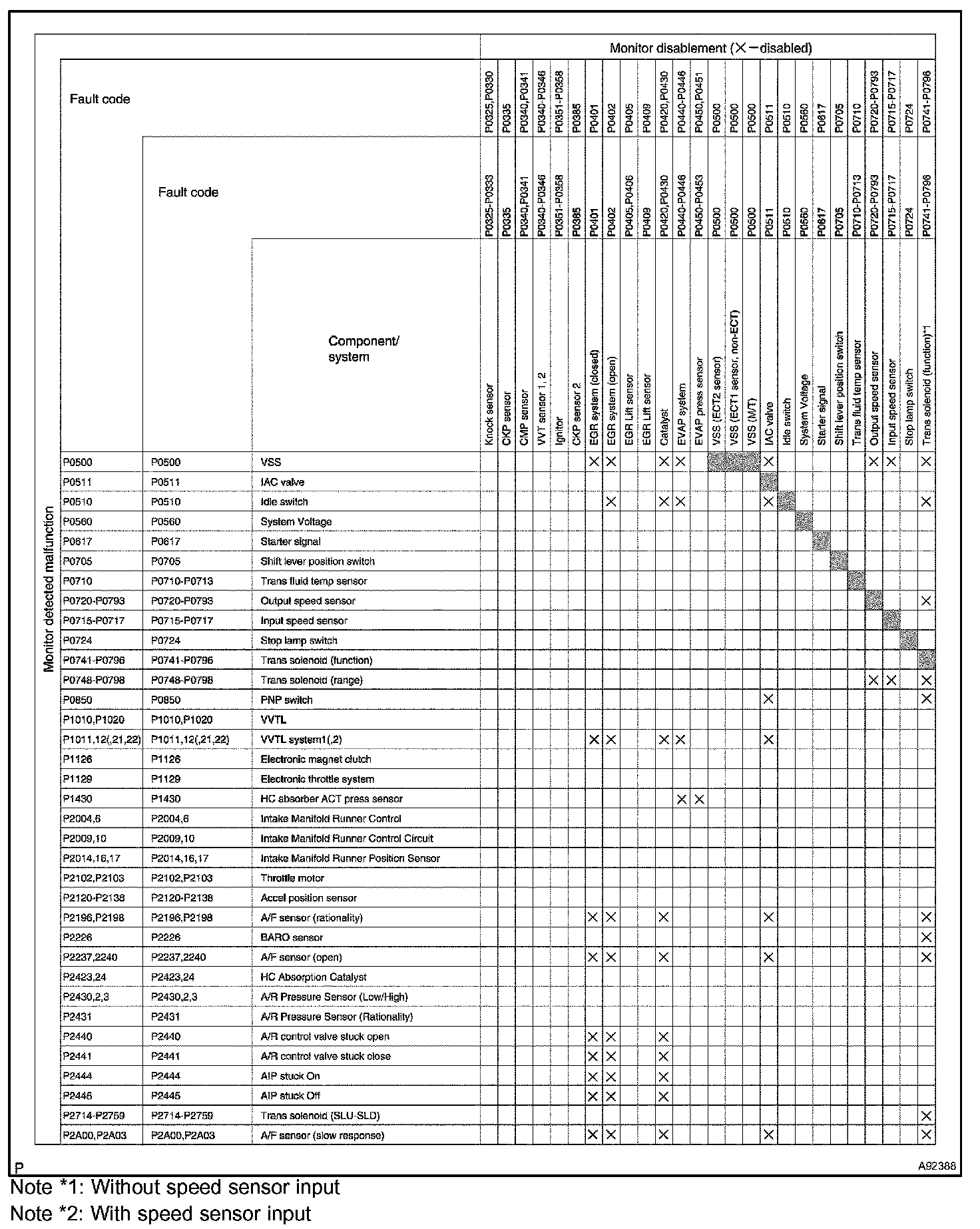 "X" indicates that when the DTC on the left is stored, detection of the DTC in the upper column is not performed.