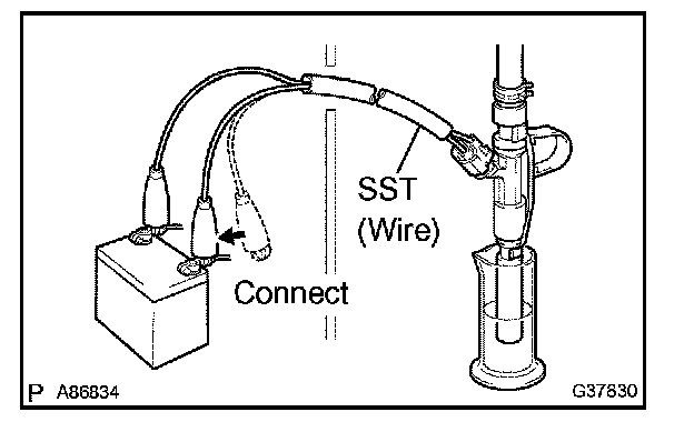 13. Connect SST (wire) to the injector and the battery for 15 seconds, and measure the injection volume with a graduated cylinder. Test each injector 2 or 3 times.