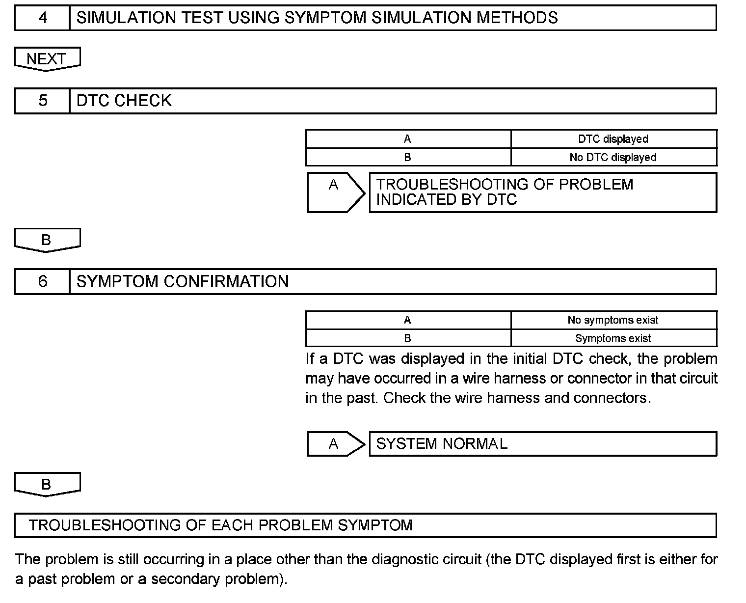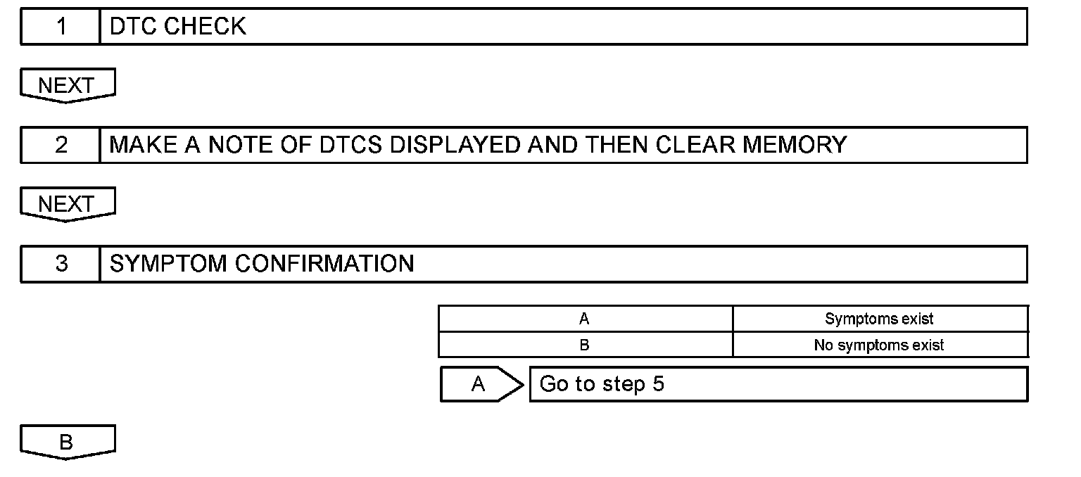 - In the DTC check, it is very important to determine whether the problem indicated by the DTC is: 1) still occurring, or 2) occurred in the past but has since returned to normal. In addition, the DTC should be compared to the problem symptom to see if they are related. For this reason, DTCs should be checked before and after confirmation of symptoms (i.e., whether or not problem symptoms exist) to determine current system conditions, as shown in the flowchart.