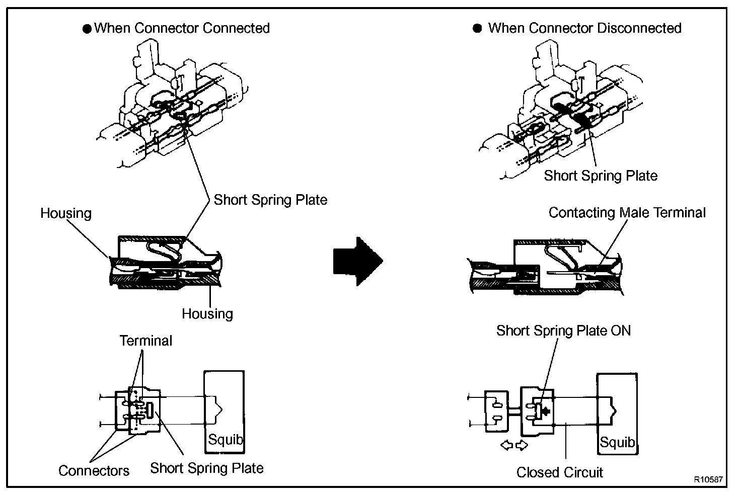 Each connector contains a short spring plate. When the connector is disconnected, the short spring plate automatically connects the positive (+) and negative (-) terminals of the squib.