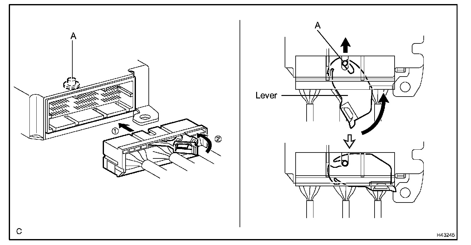 a. Pull the lever by pushing part A as shown in the illustration and disconnect the holder (with connectors).