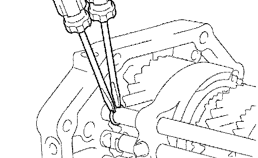 b. Using 2 screwdrivers and a hammer, remove the shift fork shaft snap ring from the reverse shift fork shaft.