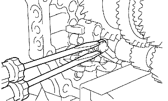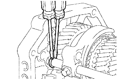 a. Using 2 screwdrivers and a hammer, remove the shift fork shaft snap ring from the 5th shift arm shaft.