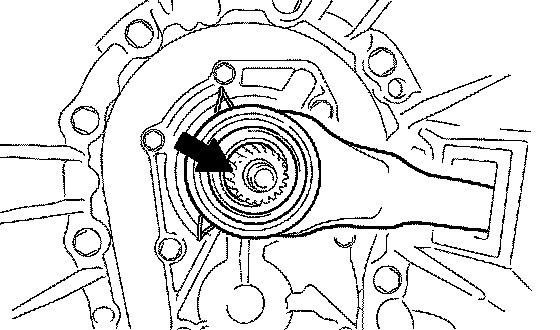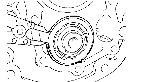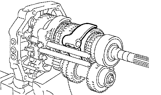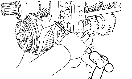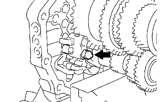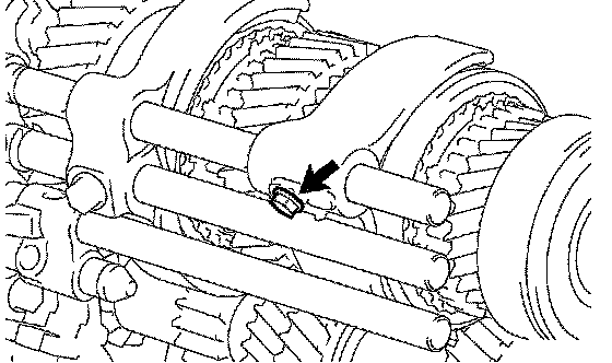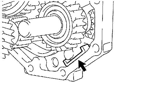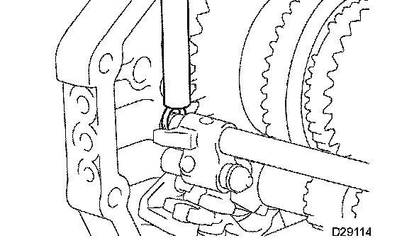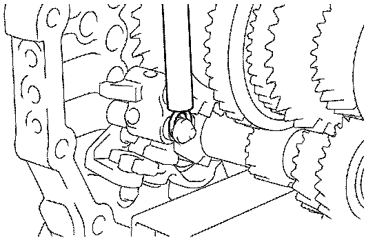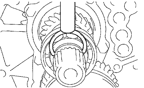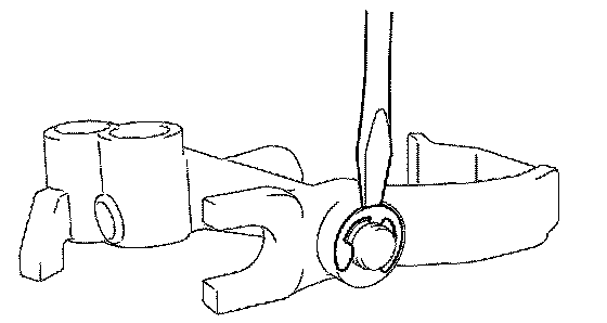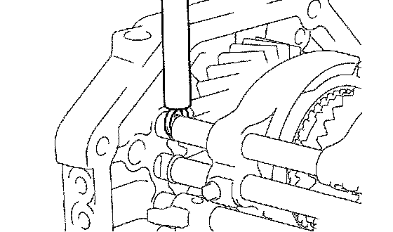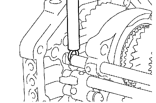 d. Using a brass bar and a hammer, install the shift fork shaft snap ring onto the 5th shift arm shaft.