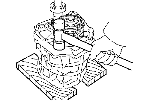 a. Select an output shaft bearing shaft snap ring so the thrust gap between the snap ring and the bearing is within the specified values. Use a brass bar and hammer to install it onto the output shaft.