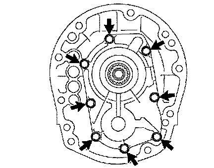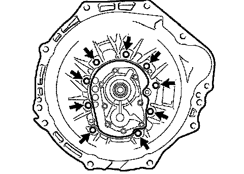 b. Install the front bearing retainer onto the transmission case with the 8 bolts.