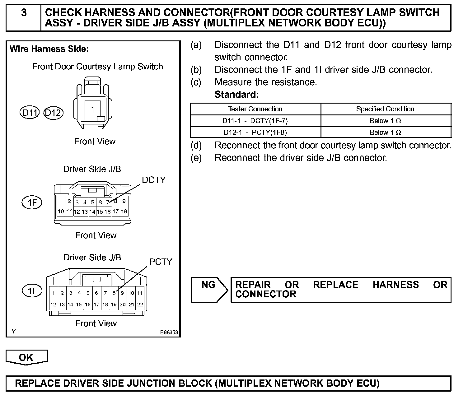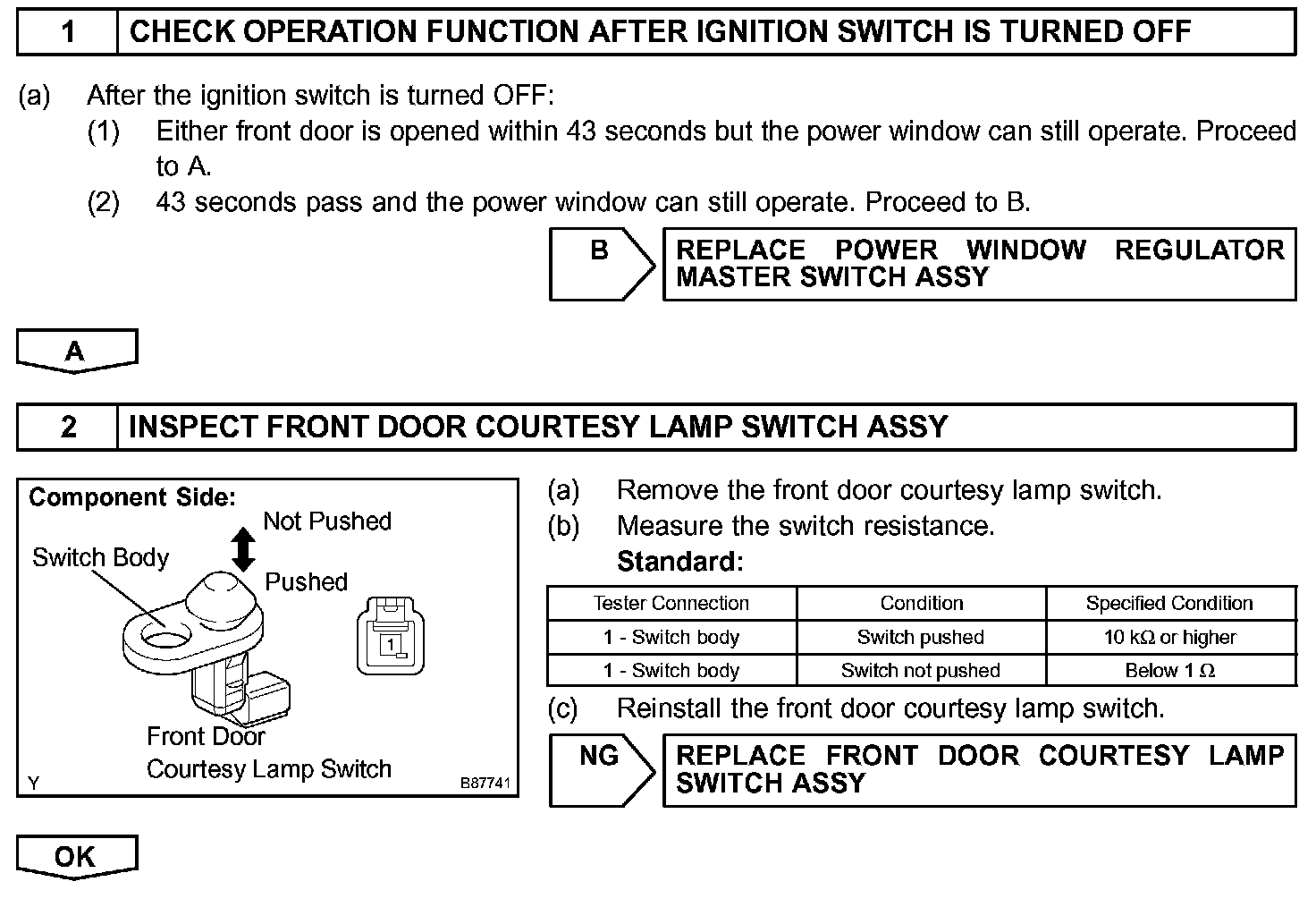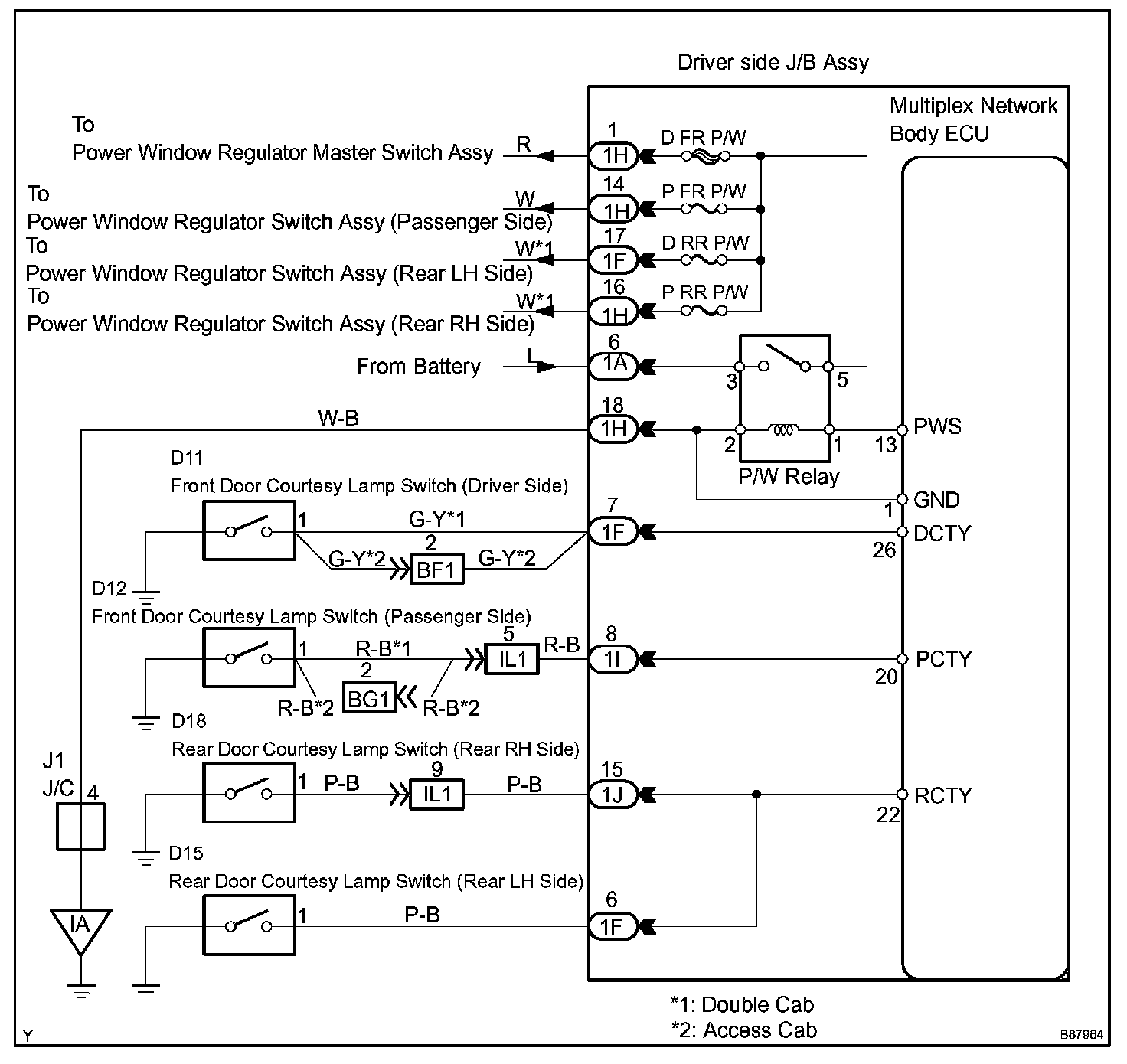 The multiplex network body ECU keeps power supplied to the power window regulator master switch assembly and the regulator switch for 43 seconds after the ignition switch is turned OFF. However, if either front door is opened, if a signal from any of the front door courtesy lamp switches is input to the ECU during this period, or if 43 seconds pass with no action being taken, the body ECU cuts power to the master switch assembly.
