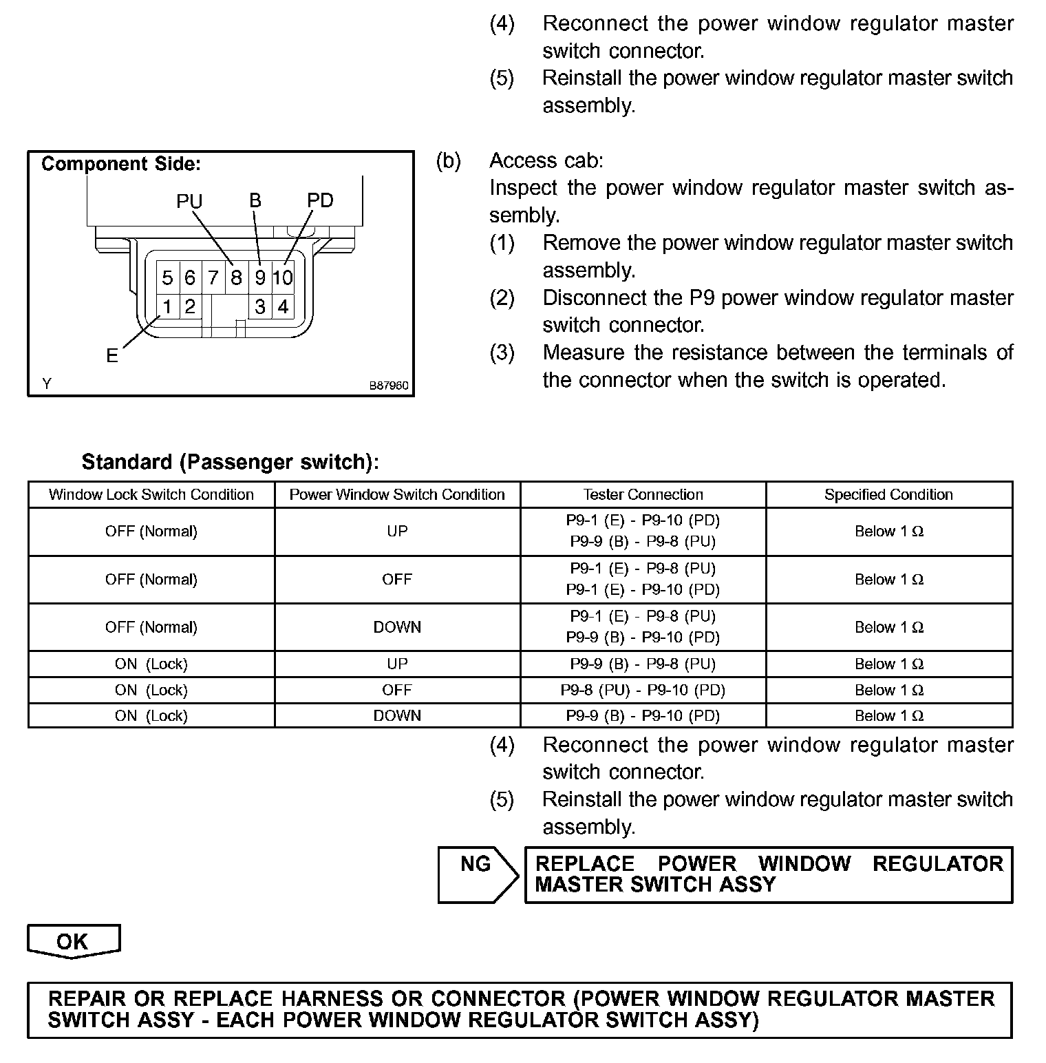 With the ignition switch ON, the power window regulator master switch assembly transmits remote switch signals to the passenger side power window and rear door power window regulator switches. Then, the regulator switches drive the power window regulator motors.