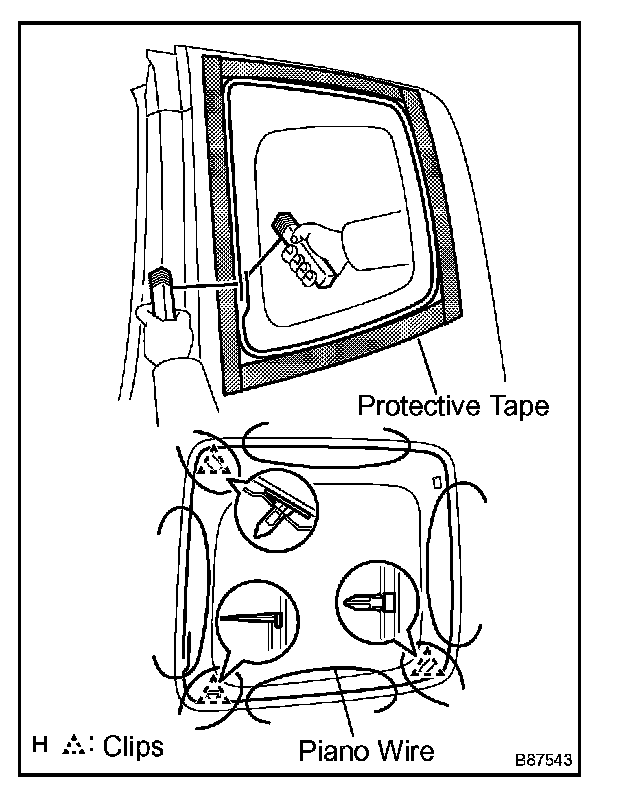 b. From the interior, insert piano wires between the vehicle body and quarter window, as shown in the illustration.