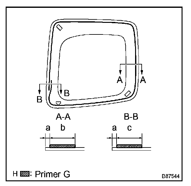b. Using a brush or sponge, apply Primer G to the edge of the quarter window and contact surface.