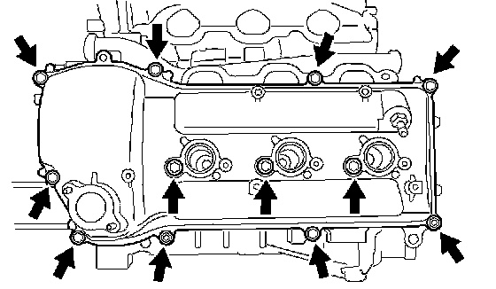 a. Remove the 10 bolts, 3 seal washers and 2 nuts, then remove the cylinder head cover.