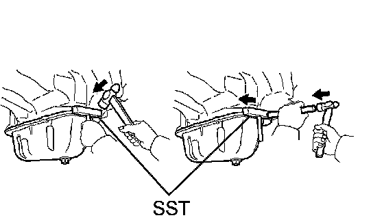 c. Insert the blade of SST between the oil pan and oil pan No.2, then cut off applied sealer and remove the oil pan No.2.