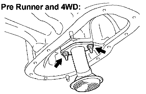 b. Remove the 2 nuts, then remove the oil strainer and gasket (for Pre Runner and 4WD).