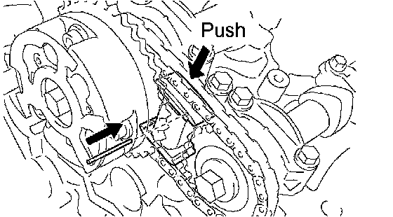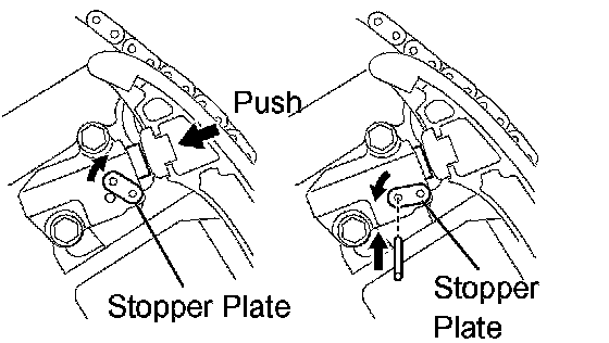 a. While turning the stopper plate of the tensioner upward, push in the plunger of the chain tensioner as shown in the illustration.