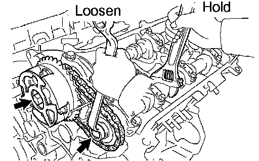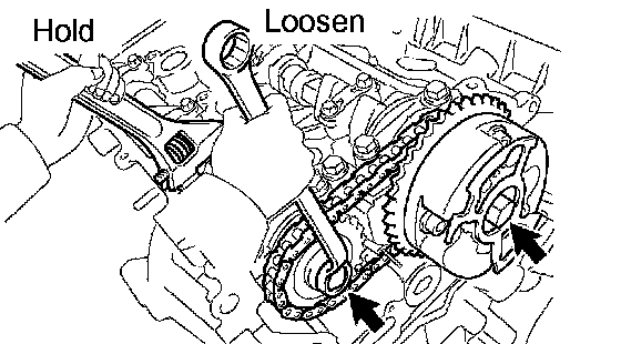 b. Hold the hexagonal portion of the camshaft with a wrench, and remove the 2 bolts, camshaft timing gear, camshaft timing gear assembly and timing chain No.2.