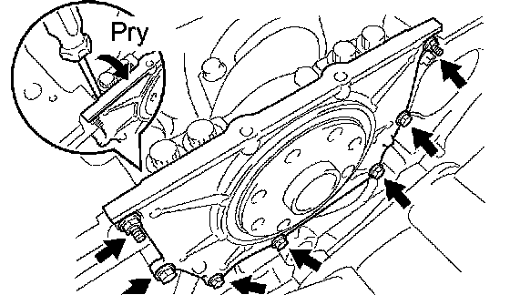 b. Remove the timing chain cover by prying between the timing chain cover, cylinder head and cylinder block with a screwdriver.