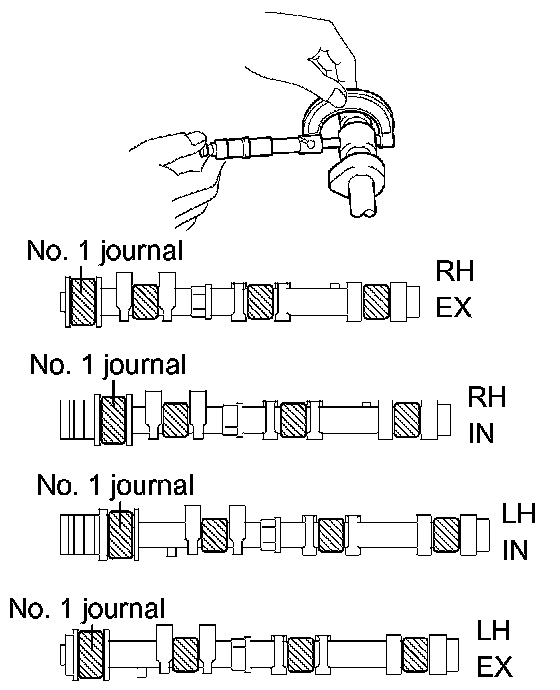 NOTICE: Keep the camshaft level while it is being removed. The camshaft thrust clearance is very small and failing to keep it level could crack or damage the cylinder head journal surface, which receives the thrust. This could subsequently lead the camshaft to seize or break. Perform the following steps to avoid such problems.
