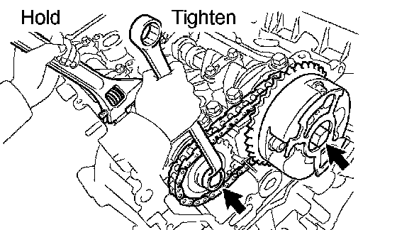 d. Hold the hexagonal portion of the camshaft with a wrench, and tighten the 2 bolts.