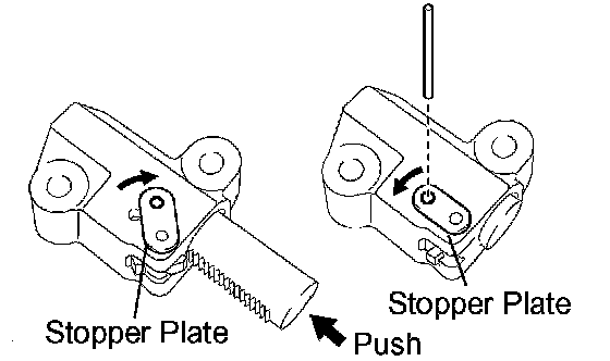 a. While turning the stopper plate of the tensioner clockwise, push in the plunger of the tensioner as shown in the illustration.