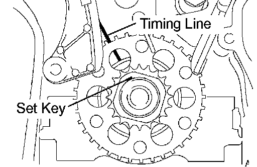 (2) Using the crankshaft pulley set bolt, turn the crankshaft to align the crankshaft set key with the timing line of the cylinder block.