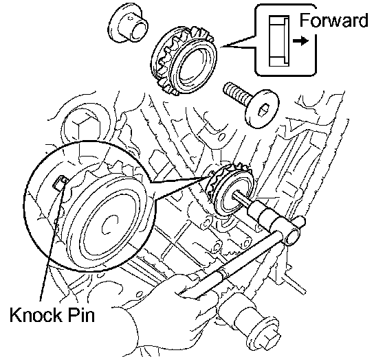 b. Temporarily install the idle gear shaft No.1 together with the idle gear shaft No.2 while aligning the knock pin of the idle gear shaft No.1 with the knock pin groove of the cylinder block.