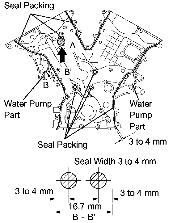 d. Apply a continuous bead of seal packing (diameter 3 to 4 mm (0.12 to 0.16 inch)) to the timing chain cover as shown in the illustration.