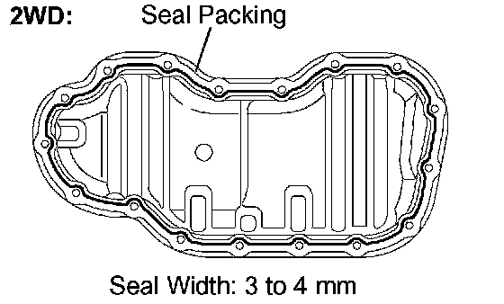 e. Apply a continuous bead of seal packing (diameter 3 to 4 mm (0.12 to 1.16 inch)) to the oil pan as shown in the illustration (for 2WD).
