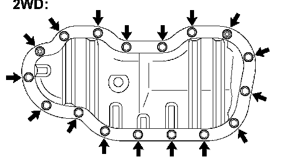 g. Install the oil pan with the 17 bolts and 2 nuts. Tighten the bolts and nuts uniformly in several steps (for 2WD).