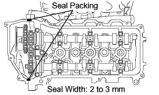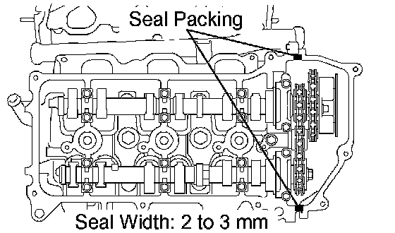 c. Apply a continuous bead of seal packing (diameter 2 to 3 mm (0.08 to 0.12 inch)) to the cylinder head and timing chain cover as shown in the illustration.