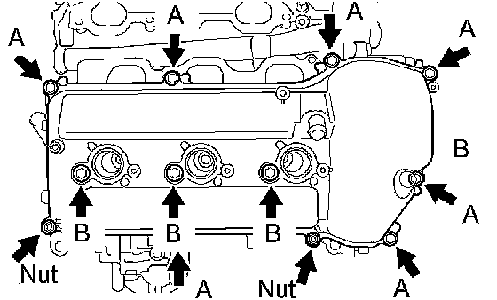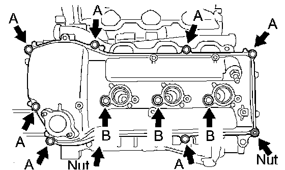 g. Install the cylinder head cover with the 10 bolts and 2 nuts. Tighten the bolts and nuts uniformly in several steps.