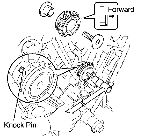 b. Temporarily install the idle gear shaft No.1 together with the idle gear shaft No.2 while aligning the knock pin of the idle gear shaft No.1 with the knock pin groove of the cylinder block.
