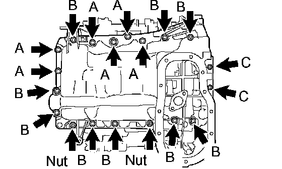d. Install the oil pan with the 17 bolts and 2 nuts, and tighten the bolts and nuts uniformly in several steps.